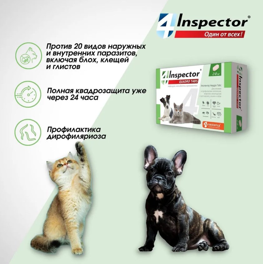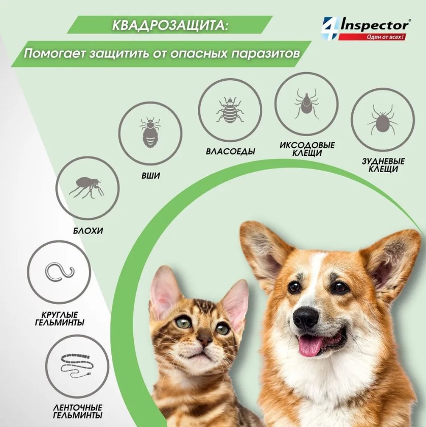 Inspector QUADRO защищает от 20 видов внешних и внутренних паразитов.