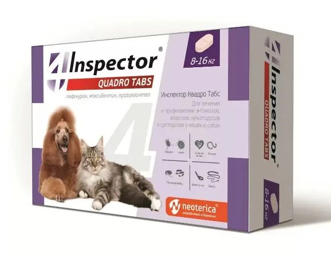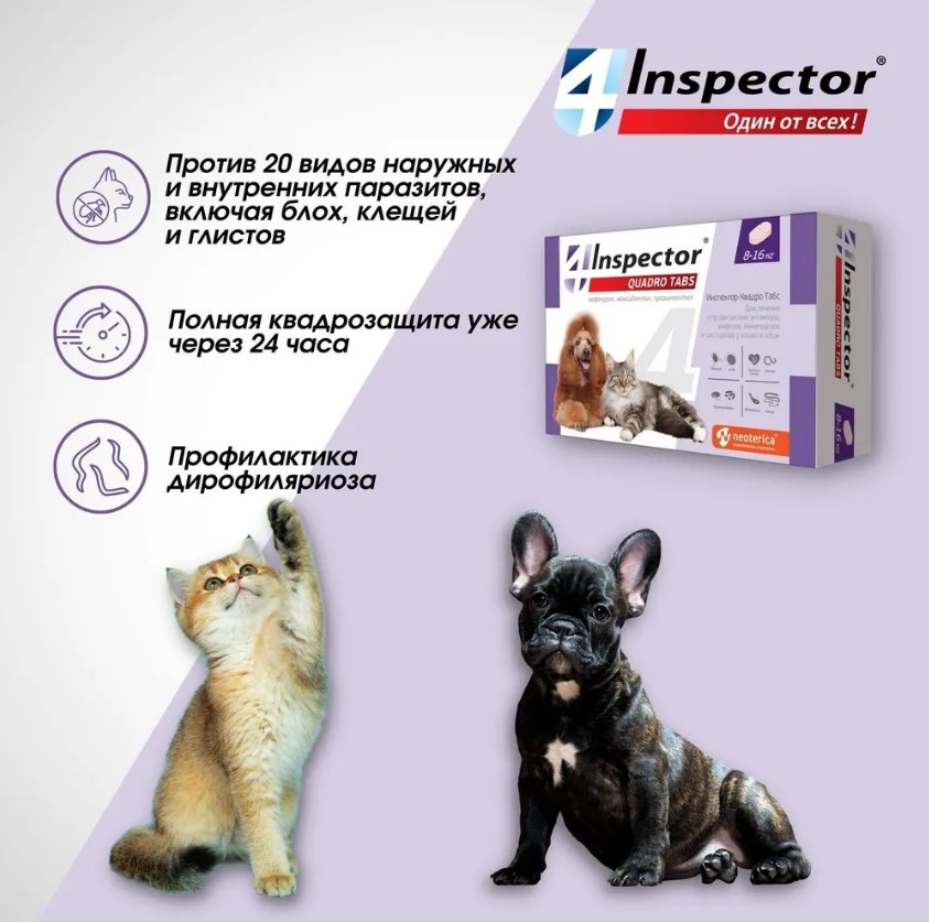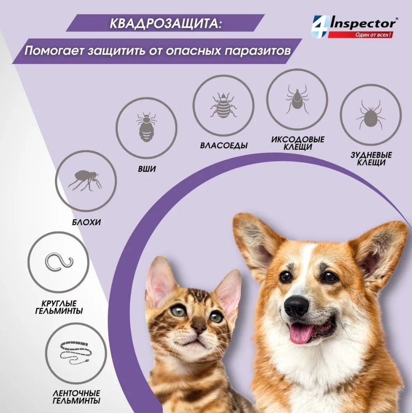 Inspector QUADRO защищает от 20 видов внешних и внутренних паразитов.