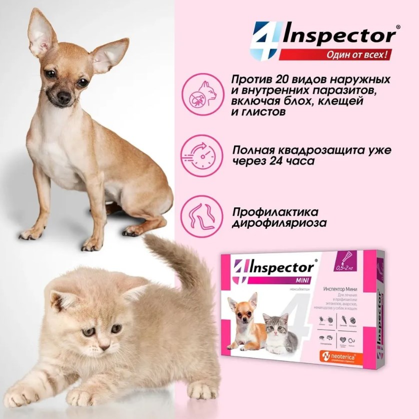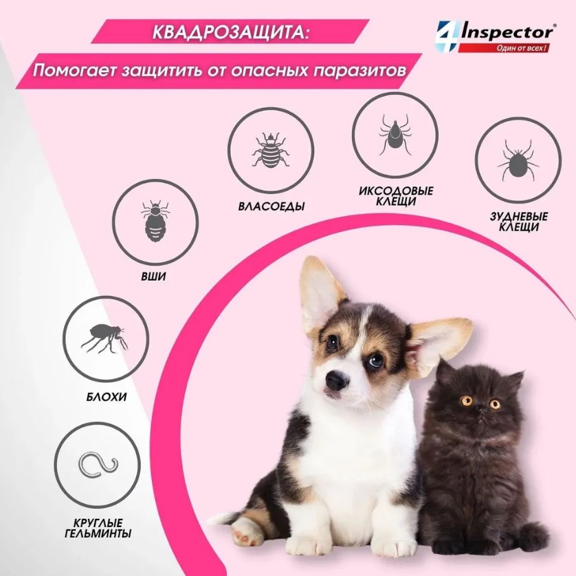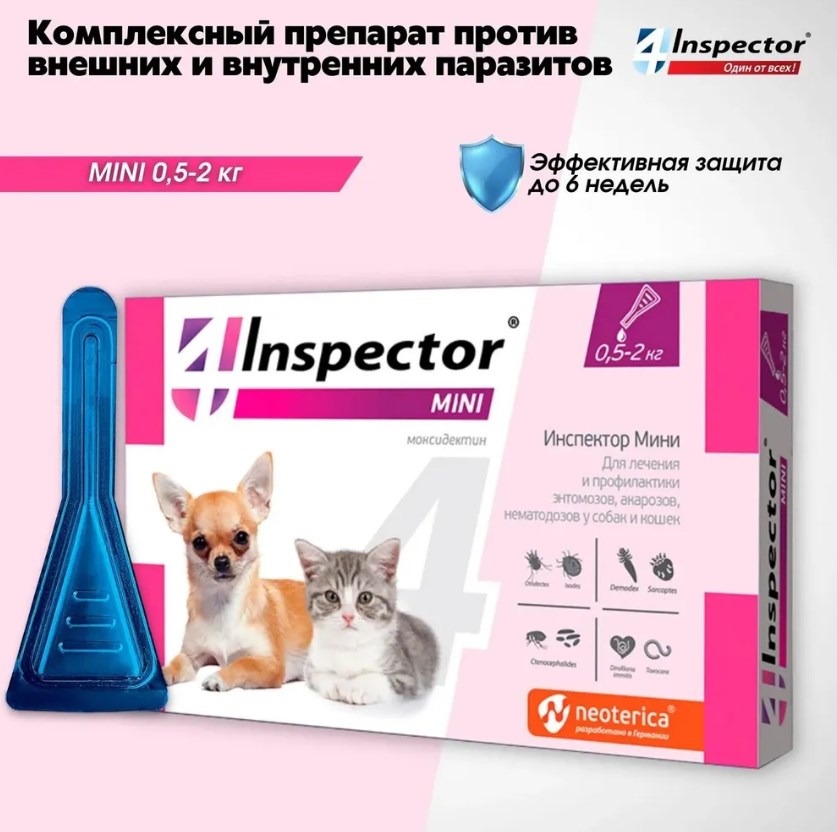 Наши собаки и кошки находятся под постоянной угрозой заражения паразитами: клещами, блохами, вшами, власоедами и гельминтами. Inspector mini защищает от 14 видов внешних и внутренних паразитов.