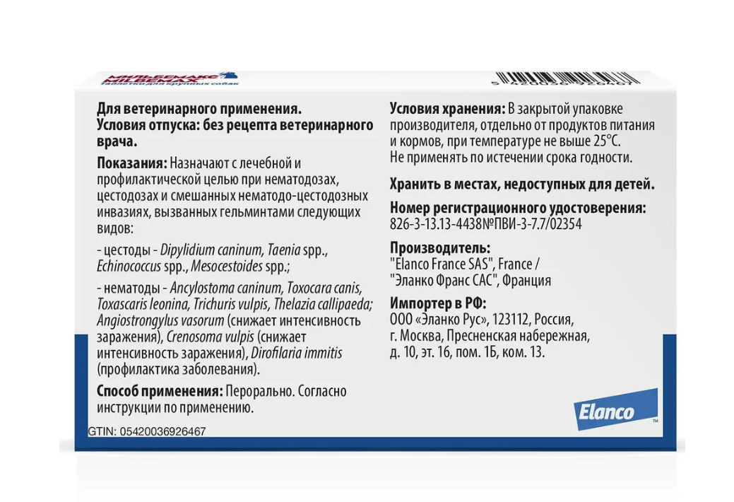 В качестве вспомогательных компонентов «Мильбемакс таблетки для собак» содержат: микрокристаллическую целлюлозу – 20%, натрия кроскармелозу – 3%, повидон – 1,5%, лактозы моногидрат – 51,5%, кремний коллоидный и магния стеарат – 2%.