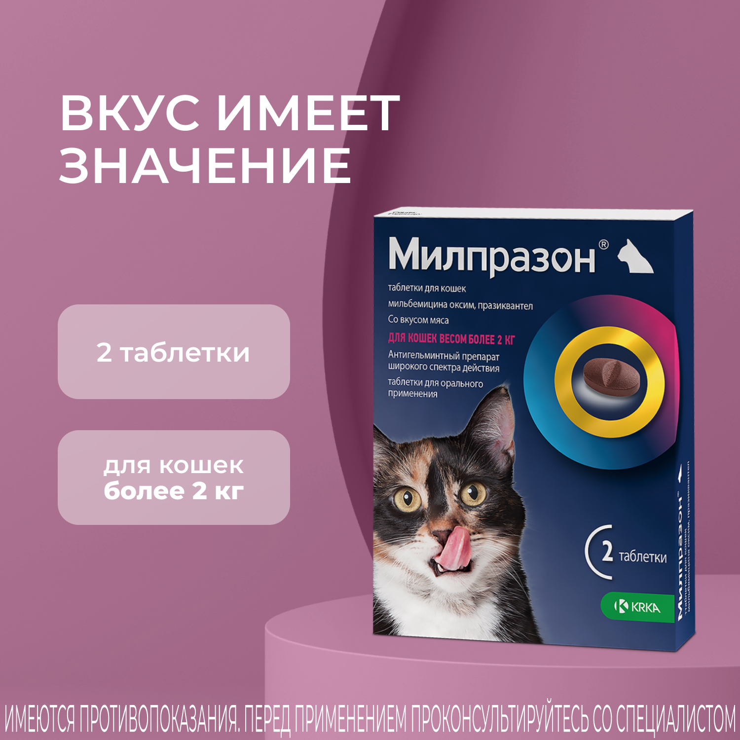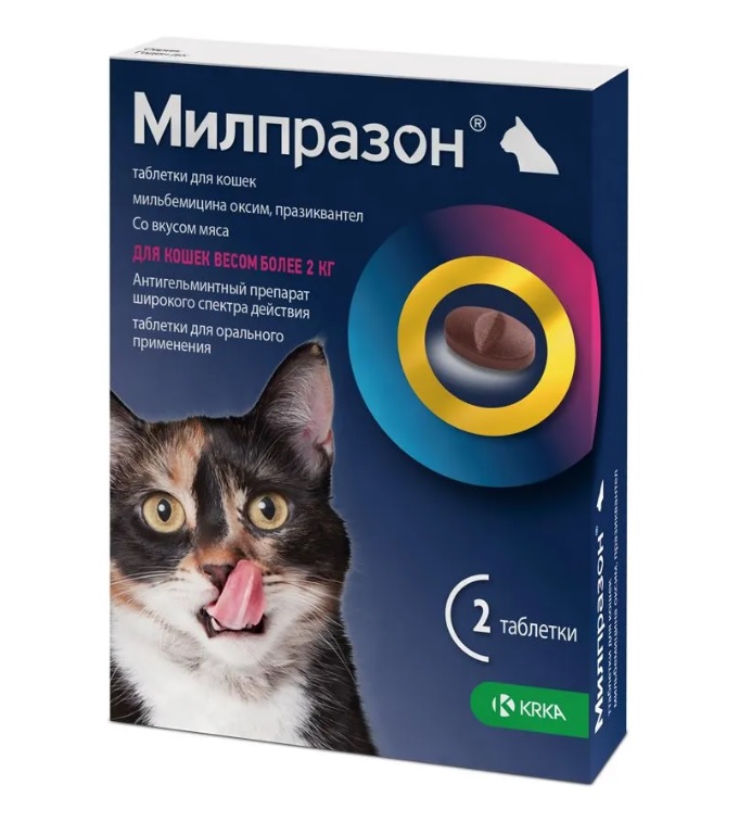 Милпразон таблетки для кошек назначают с лечебной и профилактической целью при нематодозах, цестодозах и ассоциативных нематодо-цестодозных инвазиях, вызванных как личиночными формами, так и половозрелыми цестодами и нематодами следующих видов: цестоды – Dipylidium caninum, Taenia spp., Echinococcus multilocularis; нематоды – Ancylostoma tubaeforme, Toxocara cati, Dirofilaria immitis (профилактика заболевания).
