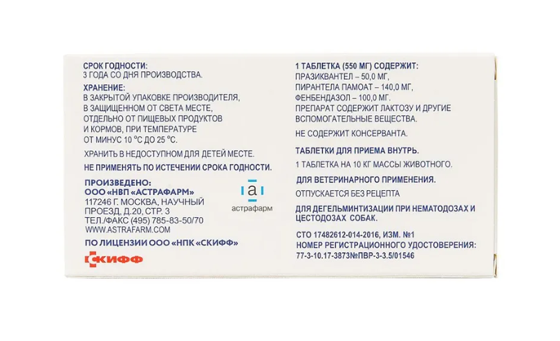 Празител плюс в одной таблетке (0,55 г) содержит в качестве действующих веществ празиквантел – 50 мг, пирантела памоат – 140 мг, фенбендазол – 100 мг, а в качестве вспомогательных веществ сахар молочный – 224,7 мг, крахмал картофельный – 17,0 мг, кальций стеариновокислый – 5,8 мг, желатин – 1,5 мг, натрий кроскармелозу – 11,0 мг.
