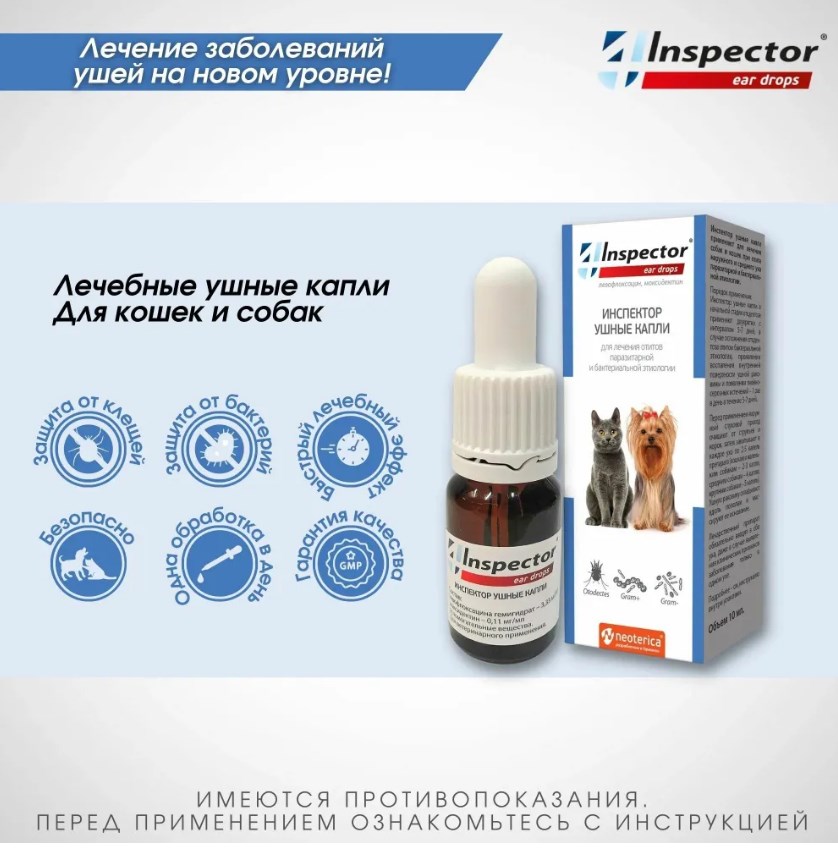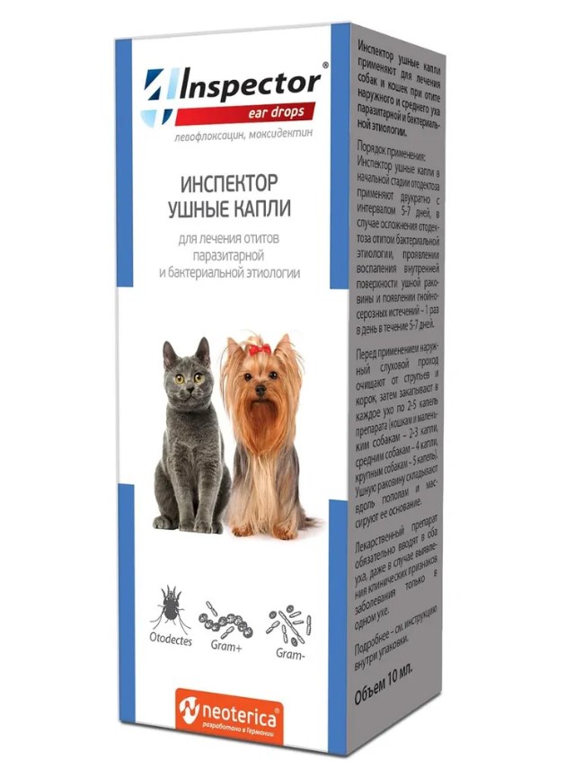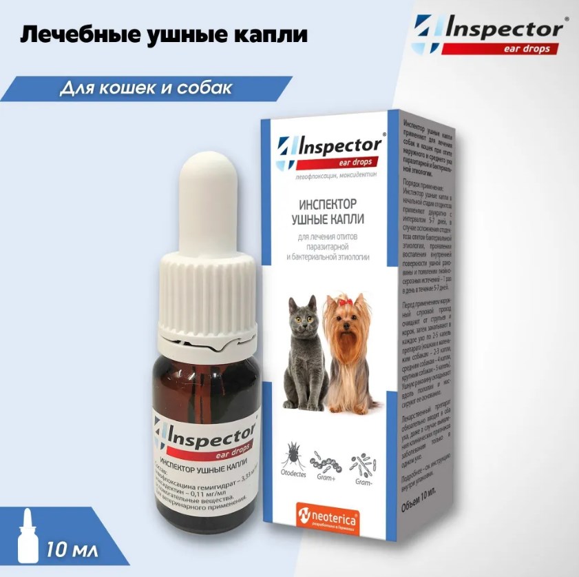 Инспектор ушные капли применяют для лечения собак и кошек при отите наружного и среднего уха паразитарной и бактериальной этиологии.
