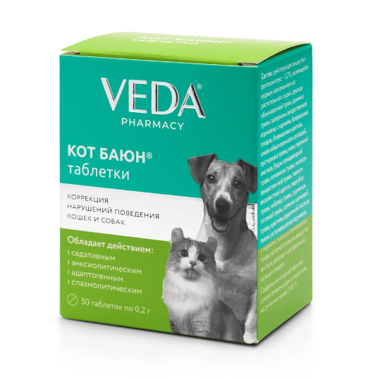 Кот Баюн – лекарственное средство для кошек и собак, содержащее в качестве действующих компонентов экстракты, отвары и настои из лекарственного растительного сырья (цветов и плодов боярышника, шишек хмеля, травы пустырника, травы душицы, травы донника, корней и корневища валерианы, листьев мяты перечной, травы будры плющевидной, травы котовника, травы мелиссы, цветов таволги вязолистной, травы зверобоя, травы чабреца, травы сушеницы топяной, травы солянки холмовой, листа крапивы, корней пиона уклоняющегося) – 3,2% и вспомогательные компоненты (лактозу, крахмал, стеарат кальция, воду дистиллированную) – до 100%.