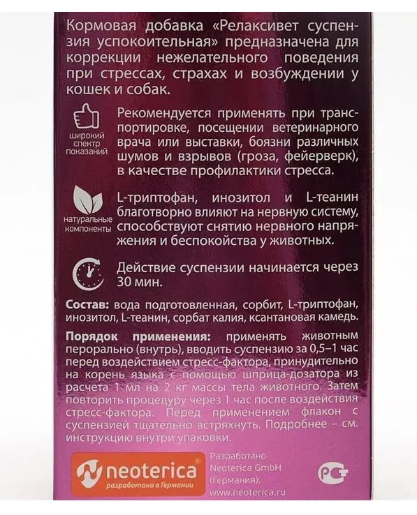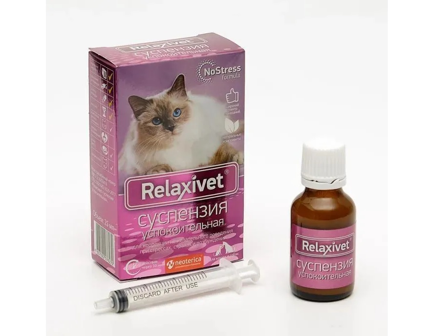 Релаксивет суспензия успокоительная предназначена для коррекции нежелательного поведения при стрессах, страхах и возбуждении у кошек и собак.