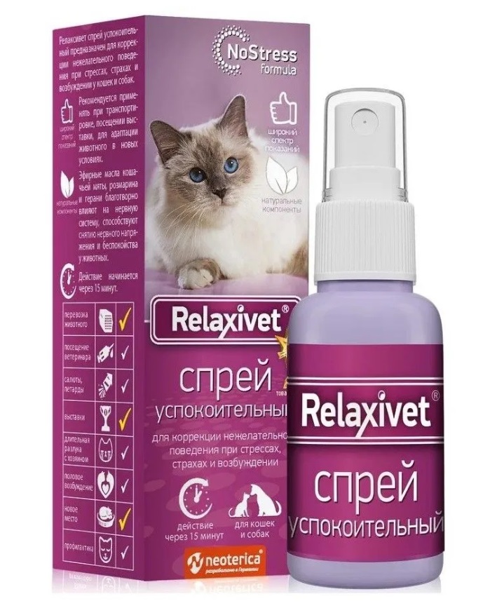 Успокоительный спрей Relaxivet благотворно влияет на нервную систему, способствует снятию нервного напряжения и беспокойства у животных, особенно при транспортировке, посещении выставок, адаптации к новым условиям.