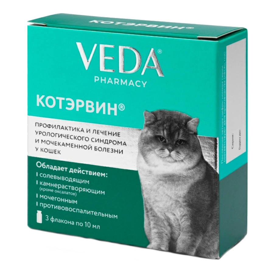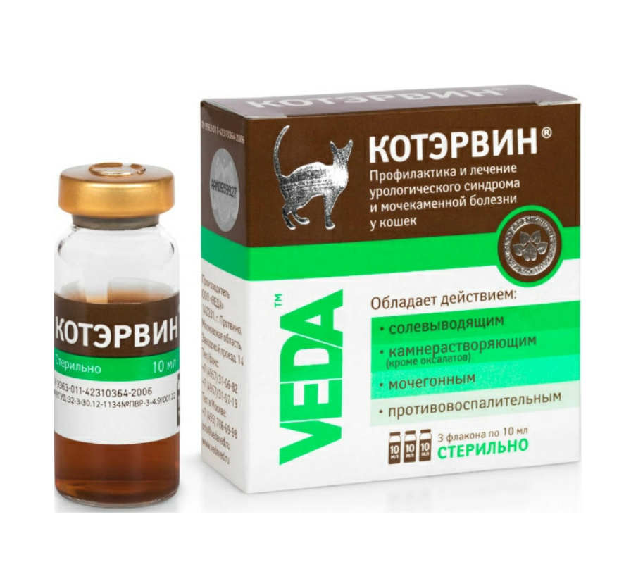 Котэрвин® назначают для профилактики и лечения урологического синдрома и мочекаменной болезни у кошек. Обладает солевыводящим, камнерастворяющим (кроме оксалатов), мочегонным и противовоспалительным действиями. Препарат КОТЭРВИН® доказал свою эффективность также в лечении мочекаменной болезни собак.