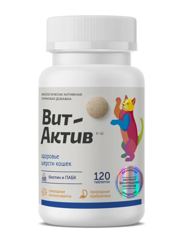 ВИТ-АКТИВ обеспечивает физиологическую потребность кошек в витаминах, аминокислотах и минеральных веществах. Стимулирует обменные процессы и поддерживает работу иммунной системы. Поддерживает остроту зрения и нормальную работу сердечно-сосудистой системы. Снижает риск возникновения заболеваний и ускоряет процесс выздоровления. Нормализует процесс пищеварения и повышает усвоение витаминов, микроэлементов и антиоксидантов.
