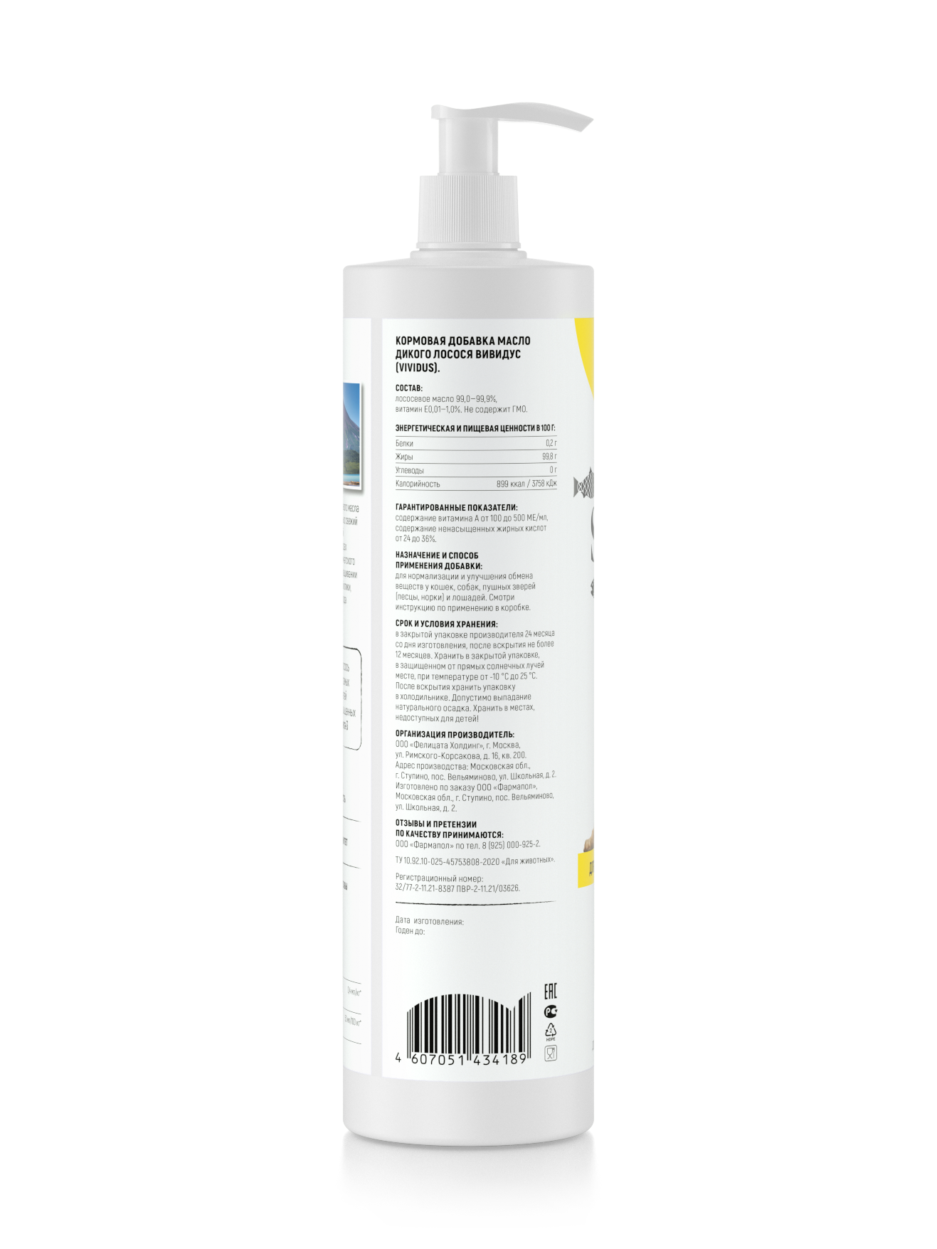 Состав: Лососевое масло 99,0% — 99,9%, витамин Е 0,01 — 1,0%