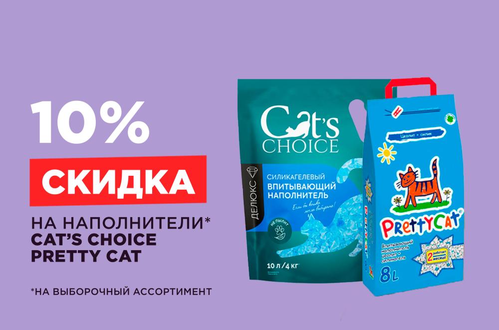 Скидки 10% на наполнители для кошачьих туалетов. Ассортимент представлен ниже.